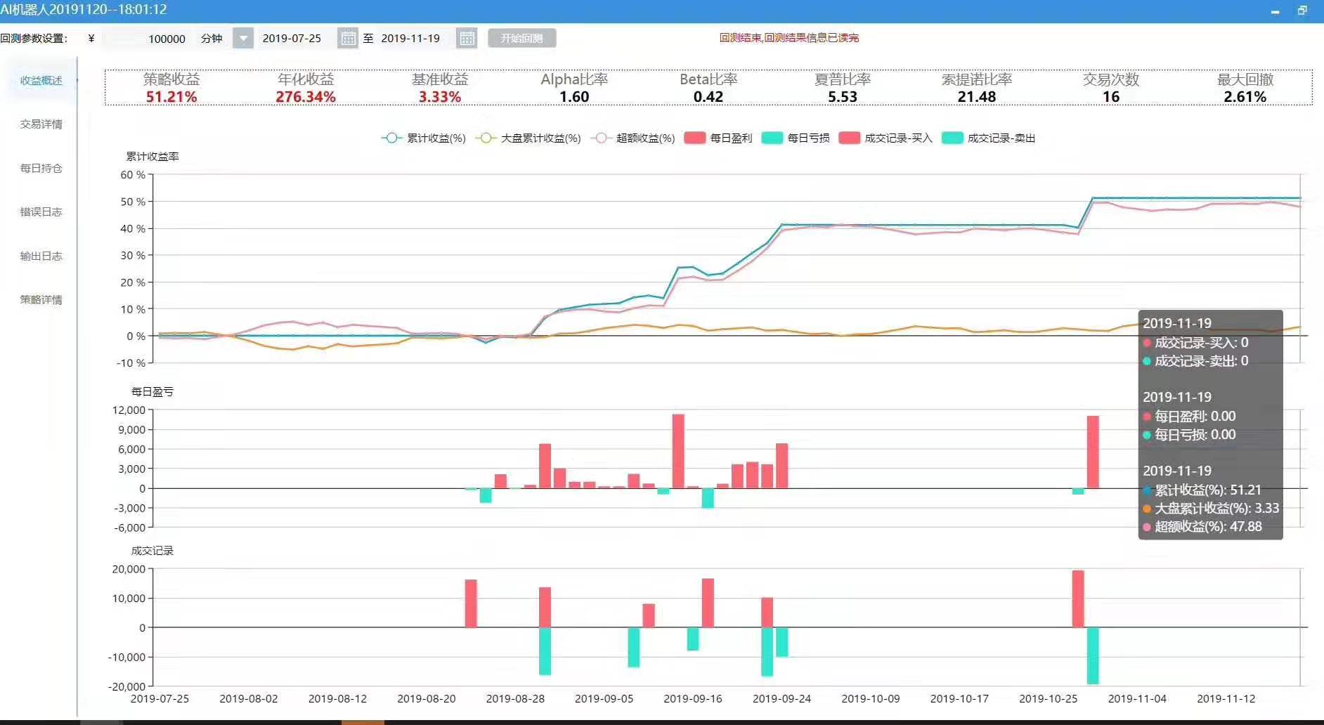 4、历史数据回测功能的优势:AI量化模型通过历史上几个牛熊轮回的买卖数据的分析计算就能得出模型的历史年化收益率,客户可以设计很多操作策略进行历史数据验证,选择收益率最理想的模型作为交易策略,这个是人工操作根本无法做到的,无论花多少时间。所以人工操作买卖决定往往是不严谨、不科学、仅凭个人感觉随意的操作方法。只有了解历史才能更准确的预测未来。